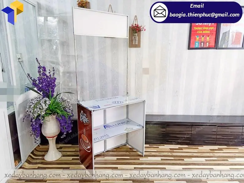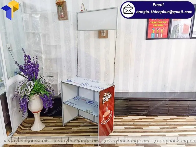 Quầy sampling lắp ráp bán cà phê là công cụ không thể thiếu cho những ai muốn bán cà phê take away nhưng không đủ vốn để mở 1 cửa tiệm cà phê “sang chảnh” ở Sài Gòn. Với ưu điểm là tính linh động, bàn lắp ráp bán cà phê mang về sẽ luôn đồng hành với bạn khắp mỗi nẻo đường thành phố. Hơn nữa bên trong quầy có tận 3 ngăn với khả năng chịu lực lên đến 100kg, bạn tha hồ để nguyên vật liệu lên đó.