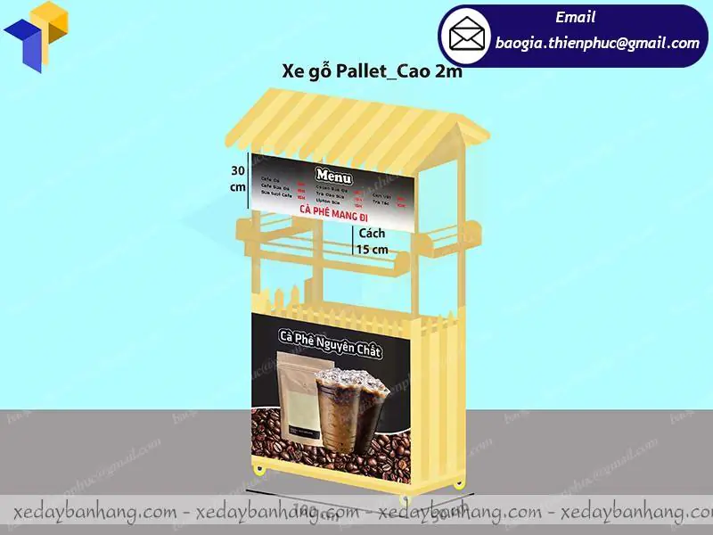 Tủ gỗ bán coffee take away được làm từ gỗ không Pallet chống thấm nước, phai màu sơn, thiết kế nhỏ gọn có các ngăn tủ đựng đồ, tủ kính trưng bày, bệ xếp bên hông và nhưng xảng menu đi kèm trên xe để khách hàng có thể tiện coi và lựa chọn món trực tiếp, vừa nhanh lẹ còn thu hút được sự chú ý của nhiều khách hàng từ xa, đó là điểm thu hút nổi bậc nhất của tủ gỗ bán hàng này mang lại. Vậy nơi sản xuất tủ gỗ bán hàng này ở đâu?